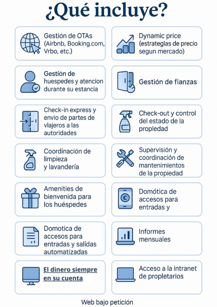 Gestión de reservas existentes y futuras, atención al huésped 24/7, sincronización de calendarios entre portales para evitar overbookings